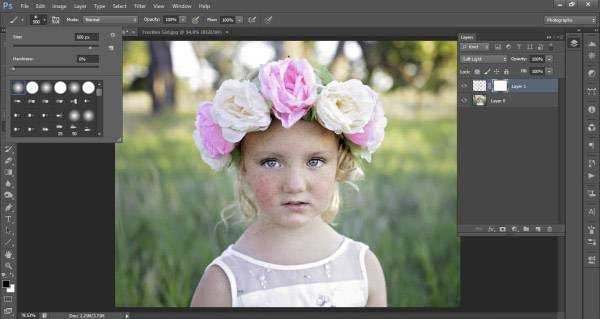 Π’Π΅ΠΏΠ΅ΡΡ Π½Π°ΠΌ Π½Π΅ΠΎΠ±Ρ ΠΎΠ΄ΠΈΠΌΠΎ ΠΏΠΎΠ΄ΠΎΠ±ΡΠ°ΡΡ ΡΠΎΡΠΎ ΡΠΎΠ»ΡΠΊΠΎ Ρ Π²Π΅ΡΠ½ΡΡΠΊΠ°ΠΌΠΈ, Ρ ΠΎΡΡΠ°Π½ΠΎΠ²ΠΈΠ»ΡΡ Π½Π° ΡΡΠΎΠΌ. ΠΡΠΊΡΠΎΠΉΡΠ΅ Π΅Π³ΠΎ Π² Photoshop, Ρ Π²ΡΠ±ΡΠ°Π½Π½ΡΠΌ ΠΈΠ½ΡΡΡΡΠΌΠ΅Π½ΡΠΎΠΌ ΠΠΈΡΡΡ (B) Π·Π°ΠΆΠΌΠΈΡΠ΅ Alt ΠΈ Π²ΠΎΠ·ΡΠΌΠΈΡΠ΅ ΠΎΠ±ΡΠ°Π·Π΅Ρ ΡΠ²Π΅ΡΠ° Ρ Π²Π΅ΡΠ½ΡΡΠ΅ΠΊ. ΠΠ΅ΡΠ΅ΠΉΠ΄ΠΈΡΠ΅ ΠΊ Π½Π°ΡΠ΅ΠΉ ΡΠΎΡΠΎΠ³ΡΠ°ΡΠΈΠΈ ΠΈ Π½Π° Π½ΠΎΠ²ΠΎΠΌ ΡΠ»ΠΎΠ΅ ΡΠ΄Π΅Π»Π°ΠΉΡΠ΅ ΠΊΠ»ΠΈΠΊ Π½Π°ΡΡΡΠΎΠ΅Π½Π½ΠΎΠΉ ΡΡΡΡ ΡΠ°Π½Π΅Π΅ ΠΊΠΈΡΡΡΡ Π½Π° Π»ΠΈΡΠ΅ Π΄Π΅Π²ΠΎΡΠΊΠΈ. ΠΠ·ΠΌΠ΅Π½ΠΈΡΠ΅ ΡΠ°Π·ΠΌΠ΅Ρ ΠΊΠΈΡΡΠΈ, ΡΡΠΎΠ±Ρ ΠΎΠ½Π° Π·Π°ΠΊΡΡΠ»Π° Π²ΡΡ Π»ΠΈΡΠΎ, Π½Π΅ ΠΏΠ΅ΡΠ΅ΠΆΠΈΠ²Π°ΠΉΡΠ΅ Π΅ΡΠ»ΠΈ Π²Π΅ΡΠ½ΡΡΠΊΠΈ Π²ΡΠΉΠ΄ΡΡ Π·Π° ΠΏΡΠ΅Π΄Π΅Π»Ρ Π»ΠΈΡΠ°, ΠΌΡ Π²ΡΡ ΠΈΡΠΏΡΠ°Π²ΠΈΠΌ. Π Π΅ΠΆΠΈΠΌ ΡΠΌΠ΅ΡΠΈΠ²Π°Π½ΠΈΡ Π΄Π»Ρ Π²Π΅ΡΠ½ΡΡΠ΅ΠΊ ΠΏΠΎΠΌΠ΅Π½ΡΠΉΡΠ΅ Π½Π° ΠΡΠ³ΠΊΠΈΠΉ ΡΠ²Π΅Ρ.