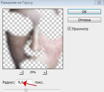 ΠΠ°Π»Π΅Π΅ ΡΠ°Π±ΠΎΡΠ°Π΅ΠΌ Ρ ΡΠΈΠ»ΡΡΡΠΎΠΌ Β«Π Π°Π·ΠΌΡΡΠΈΠ΅ ΠΏΠΎ ΠΠ°ΡΡΡΡΒ» (Gaussian Blur), Π½Π°Ρ ΠΎΠ΄ΠΈΠΌ Π΅Π³ΠΎ Π² ΠΌΠ΅Π½Ρ Π€ΠΈΠ»ΡΡΡ -> Π Π°Π·ΠΌΡΡΠΈΠ΅ (Filter->Blur). Π ΠΎΠΊΠ½Π΅ Π½Π°ΡΡΡΠΎΠΉΠΊΠΈ ΡΠΈΠ»ΡΡΡΠ° ΡΡΡΠ°Π½Π°Π²Π»ΠΈΠ²Π°Π΅ΠΌ Π·Π½Π°ΡΠ΅Π½ΠΈΠ΅ ΡΠ°Π΄ΠΈΡΡΠ° ΡΠ°Π²Π½ΠΎΠ΅ 9 px. ΠΡΠΎΡ ΠΏΠ°ΡΠ°ΠΌΠ΅ΡΡ ΠΏΠΎΠ΄Π±ΠΈΡΠ°Π΅ΡΡΡ Π΄Π»Ρ ΠΊΠ°ΠΆΠ΄ΠΎΠ³ΠΎ ΡΠΎΡΠΎ ΠΎΠΏΡΡΠ½ΡΠΌ ΠΏΡΡΡΠΌ, ΡΠ»Π΅Π΄ΡΠ΅Ρ ΠΎΠ±ΡΠ°ΡΠ°ΡΡ Π²Π½ΠΈΠΌΠ°Π½ΠΈΠ΅ Π½Π° ΡΠΎ, ΡΡΠΎΠ±Ρ Π²Π΅ΡΠ½ΡΡΠΊΠΈ ΠΏΡΠ°ΠΊΡΠΈΡΠ΅ΡΠΊΠΈ ΠΏΠΎΠ»Π½ΠΎΡΡΡΡ ΡΠ»ΠΈΠ»ΠΈΡΡ Π² ΠΎΠ΄ΠΈΠ½ ΡΠ²Π΅Ρ: