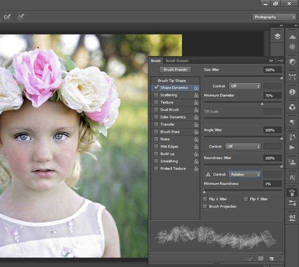ΠΠ»Ρ ΠΏΠ°ΡΠ°ΠΌΠ΅ΡΡΠΎΠ² Angle Jitter (ΠΠΎΠ»Π΅Π±Π°Π½ΠΈΠ΅ ΡΠ³Π»Π°) ΠΈ Roundness Jitter (ΠΠΎΠ»Π΅Π±Π°Π½ΠΈΠ΅ ΡΠΎΡΠΌΡ) ΡΠ°ΠΊ ΠΆΠ΅ ΡΡΡΠ°Π½ΠΎΠ²ΠΈΡΠ΅ ΠΌΠ°ΠΊΡΠΈΠΌΠ°Π»ΡΠ½ΠΎΠ΅ Π·Π½Π°ΡΠ΅Π½ΠΈΠ΅ 100%, ΡΡΠΎ ΠΏΠΎΠ·Π²ΠΎΠ»ΠΈΡ ΠΏΠΎΠ²ΠΎΡΠ°ΡΠΈΠ²Π°ΡΡ ΠΊΠΈΡΡΡ, ΠΈ Π΅Ρ ΠΎΡΠΏΠ΅ΡΠ°ΡΠΎΠΊ Π±ΡΠ΄Π΅Ρ ΡΠΎΠ·Π΄Π°Π²Π°ΡΡΡΡ ΡΠ»ΡΡΠ°ΠΉΠ½ΡΠΌ ΠΎΠ±ΡΠ°Π·ΠΎΠΌ.