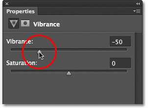 Этим слоем мы будем управлять через панель Properties. Сместите ползунок Vibrance влево, это снизит насыщенность цветов в размытой зоне. Изменение насыщенности цветов происходит в зависимости от насыщенности оригинала: даже если вы сместите ползунок влево до самого конца, до значения -100, изображение все равно не утратит цвет окончательно; а при использовании ползунка Saturation насыщенность снижается одинаково и цвет можно удалить полностью. В данном случае я не буду доходить до самого края, мне подойдет значение -50: