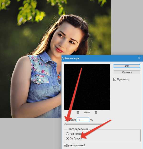 Когда Вы будете печатать обработанный снимок, Вас может настигнуть такая проблема: виньетка представляет собой некоторое количество овалов разнообразных оттенков. Для того, чтобы этого не произошло, используйте меню программы: «Фильтр — Шум — Добавить шум». Размер шума задаем в пределах 3%, размытие необходимо выбрать «По Гауссу» — все готово, жмем «Ок».