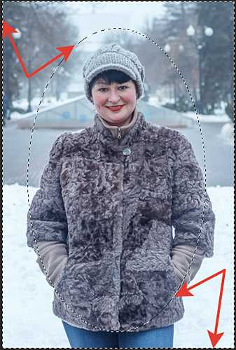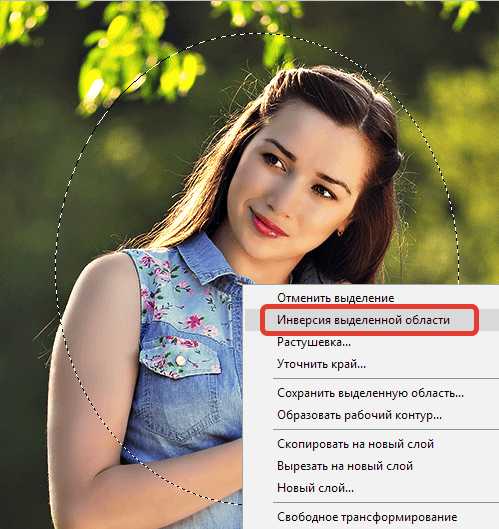 На данный момент выделен центр фотографии, всё, что внутри овала, а нам нужно выделить всё, что находится снаружи. Для этого переходим на вкладку Select (Выделение) — Inverse (Инверсия) или просто нажимаем Shift+Ctrl+I.
