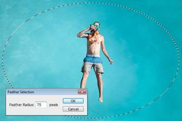 Растушевка позволит сделать плавный переход. Растушевку можно сделать клацнув правой кнопкой мыши и выбрав соответствующее меню или перейдя в Select (Выделение) — Modify (Модификация) — Feather (Растушевка). Значение растушевки следует подбирать экспериментальным путем, так как для снимков различного разрешения оно будет создавать различный эффект.