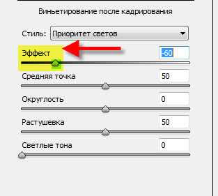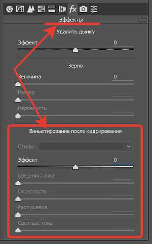 Щелкнем по иконке «Effects» («Эффекты») (четвертая иконка справа), мы увидим вкладку «Post Crop Vignetting» («Виньетирование после кадрирования»), с которой и будем работать.