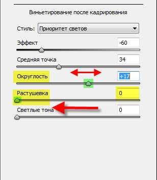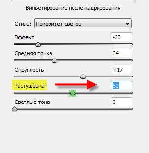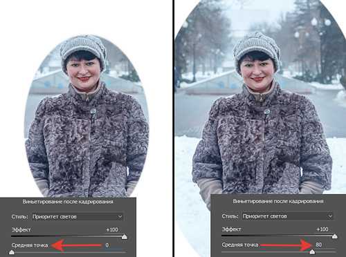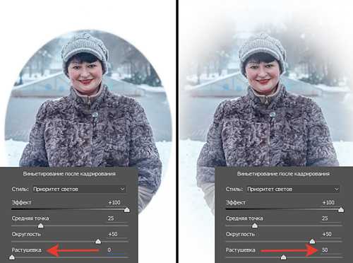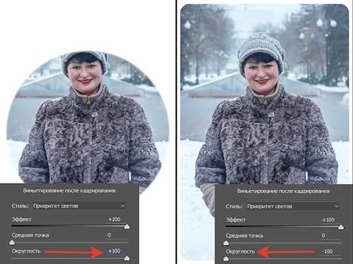 Под ползунком «Midpoint» («Средняя точка») находится ползунок «Roundness» («Округлость»), который управляет округлостью виньетирования (чтобы лучше понять, что делает ползунок «Roundness», понизьте до 0 величину «Feather» («Растушевка»). Перетащив его до конца вправо, получим круг, а до конца влево – фактически прямоугольник с закругленными углами.