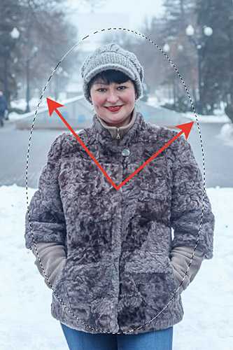 Видите тонкий овал? Там достигается стопроцентное размытие. За этой чертой все размыто на сто процентов. Присмотритесь, и вы заметите на контуре овала четыре небольшие точки: вверху, внизу, слева и справа. Удерживая клавишу Shift, кликните мышью по верхней точке и, не отпуская ее, переместите вверх – туда сместится и граница полного размытия. Не следует располагать точку на верхней границе кадра. Нижняя граница сместится, соответственно, к нижней границе кадра. Нажатие клавиши Shift позволяет производить движение строго в вертикальной плоскости: