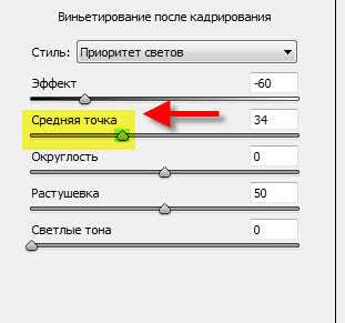 Затем используем ползунок «Midpoint» («Средняя точка»), чтобы выбрать, на какую часть изображения распространится виньетирование.