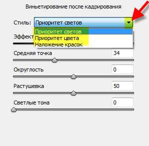 А теперь о том, что добавлено в CS5. Вверху данной секции находится выпадающий список «Style» («Стиль») с тремя различными типами виньетирования. Тип «Highlight Priority» («Приоритет светов»), безусловно, наилучший, он пытается сохранить детали в светах, затемняя их кромки. Тип «Color Priority» («Приоритет цвета») пытается сохранить цвета затемненной области. И тип «Paint Overlay» («Наложение красок») – старый метод от CS4, который лучше избегать. Выбираем «Приоритет светов».