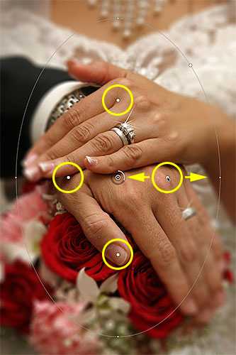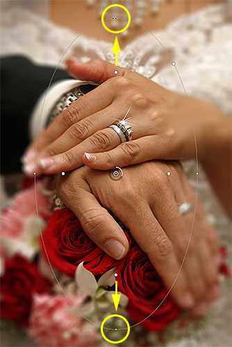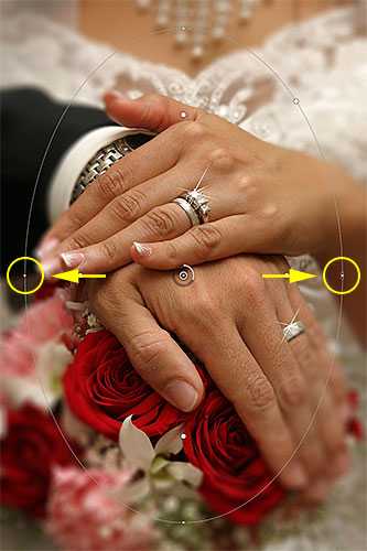 Между центральной булавкой и границей полного размытия есть еще четыре точки, которые управляют шириной переходной зоны размытия. Участок между центральной точкой и этими четырьмя точками не подвергается размытию. Спецэффект вступает в силу возле этих точек и достигает своего предела на границе полного размытия. Если нажать мышью на любую из них и начать перемещать, все четыре точки сместятся одновременно. Если их сдвинуть ближе к центру, размытие будет постепенным, с более широкой переходной зоной, а если расположить их ближе к овальной границе, переход, наоборот, станет более резким.