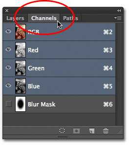 Вы увидите, что под каналами Red, Green и Blue был создан альфа-канал с названием Blur Mask. Нам нужно загрузить этот канал Blur Mask как выделение. Для этого нажмите Ctrl (Win) / Command (Mac) на клавиатуре и кликните мышью по любой точке канала: