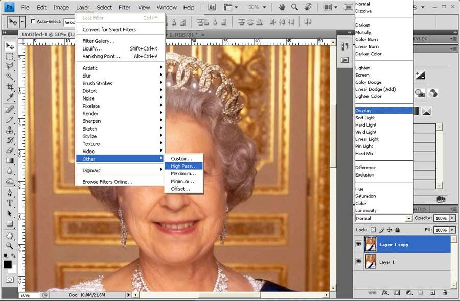 4. Когда корректировка завершена, нажмите OK, вернитесь на панель «Слои» и измените режим наложения слоя на «Перекрытие».