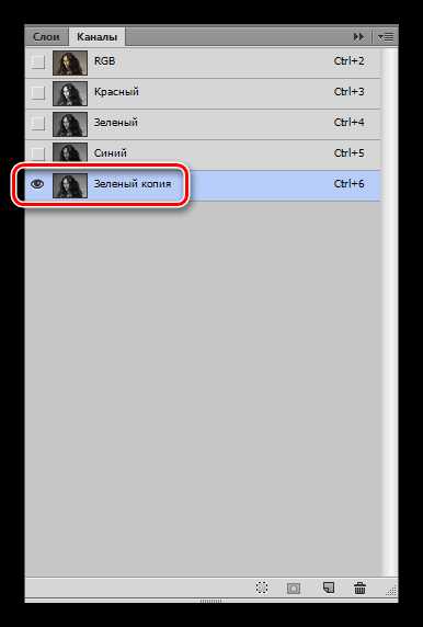 - На этой вкладке нам понадобится зеленый канал, по которому необходимо кликнуть. С других автоматически снимется видимость, а изображение обесцветится.