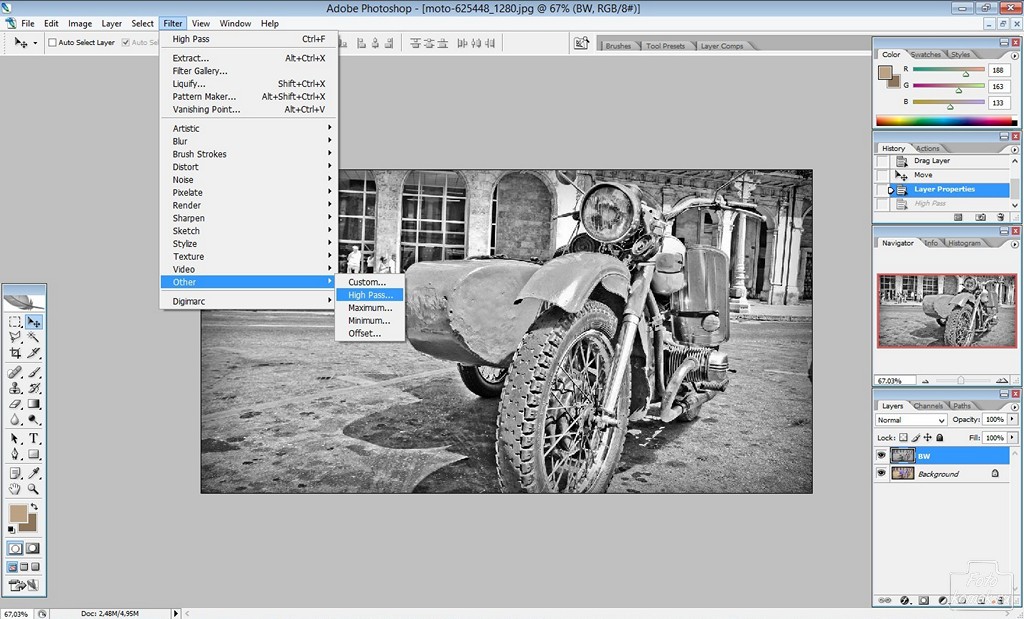 Пожалуй самый простой способ создания черно белой фотографии следующий. Откройте любую фотографию и выберите в меню Image > Adjustiments > Desaturate или нажмите Ctrl+Shift+U Все. И это самый простой способ создания чено-белой фотографии в Фотошопе. К сожалению самый простой способ имеет самый большой изъян: полное отсутствие контроля за цветом.