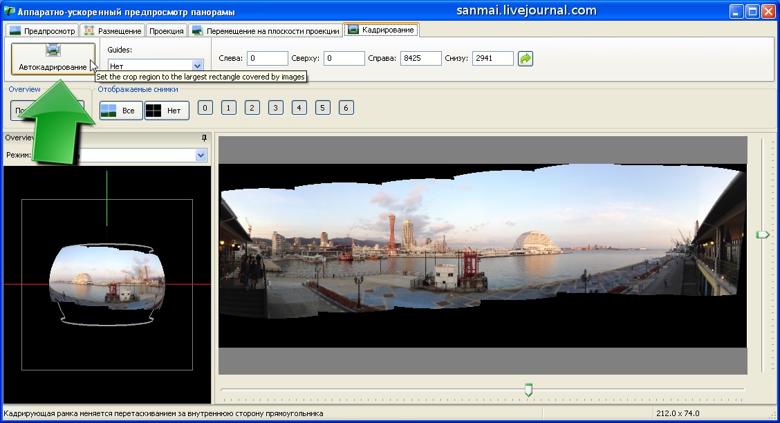 В большинстве случаев автоматический режим работает весьма корректно, однако если вы точно не знаете каким способ сняты склеиваемые панорамные снимки, попробуйте все режимы проекции панорамы: