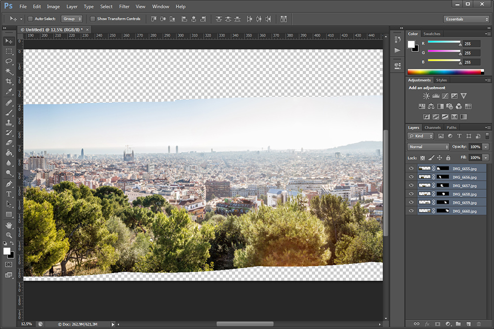Если ваша панорама состоит из достаточно большого количества исходных снимков, удобно после переноса каждого исходного снимка в конечный файл панорамы сразу же их закрывать — они нам уже не понадобятся. В итге, после перноса всех исходных панорамных снмков в один файл у вас останется открытым только конечный файл — со слоями которые нам предстоит превратить в панораму.