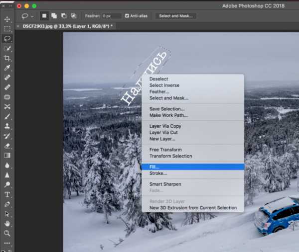 После этого кликаем правой клавишей мыши по выделенной области и выбираем пункт меню Fill/«Выполнить заливку».