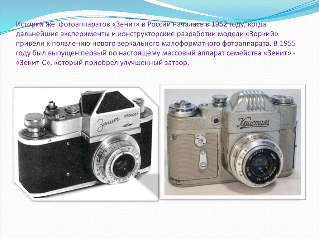 - В послевоенные годы во многих странах стала выпускаться пленочная фототехника. Не остался в стороне СССР. Массовыми моделями стали марки Зенит, Чайка, Салют.