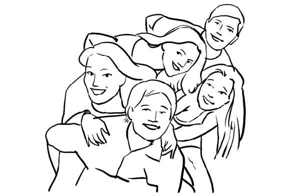 6. Позиция идеально подойдет для компании близких друзей. Попросите всех участников группового снимка встать ближе друг к другу, прислониться головами и слегка наклониться по направлению к камере.