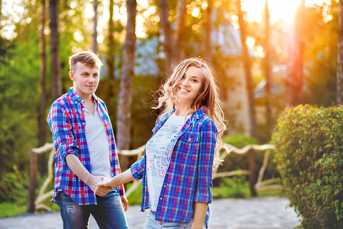 Для городской прогулки выбирайте более современные образы: кожаные куртки, конверсы и ботинки, футболки и джинсы. Для съемок в стиле рустик, например, в поле, парке или деревенской местности стоит выбрать летящие платья для девушки и легкие, светлые рубашки для молодого человека – однотонные или с рисунком типа клетки. От джинсов в данном случае стоит отказаться в пользу брюк из хлопка, твида или неплотной шерсти.
