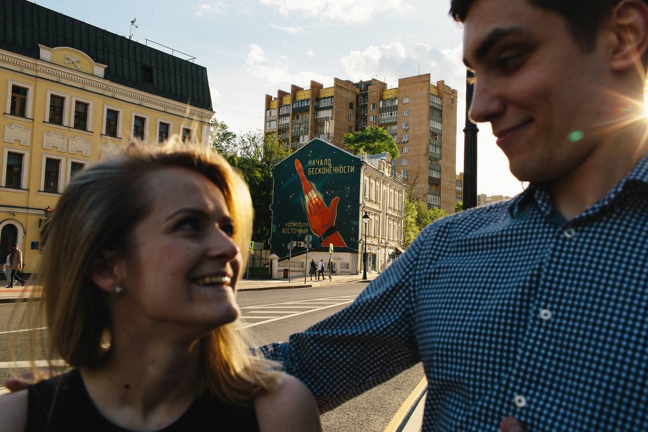 У меня в голове были какие-то активные движения — кадры, где ребята бегут через переход, какие-то портреты с красивым светом, с тенями, моменты, когда они забудут про меня, и начнут дурачится. Мне хотелось поймать поцелуй на пешеходном переходе, но время было вечернее, все спешили с работы, и в кадр все время попадали машины, пешеходы, велосипедисты.