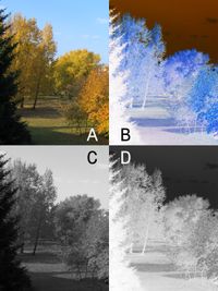 Позитив и негатив. A — цветной позитив. B — цветной негатив. C — чёрно-белый позитив. D — чёрно-белый негатив.Негатив (лат. negativus — отрицательный), в чёрно-белой фотографии и кинематографии образованное зёрнами металлического серебра изображение объекта съёмки, в котором почернения фотографические обратны яркостям деталей объекта: чем ярче деталь, тем большим почернением (оптической плотностью) она воспроизведена. В цветных фотопроцессах изображение объекта съёмки формируется красителями, цвета которых дополнительны к цветам объекта съёмки. Например, синие предметы на цветном негативе выглядят жёлтыми, зелёные — пурпурными, а красные — голубыми и так далее (см. Дополнительные цвета, Цветоделение). Оптические плотности при этом также обратны объекту съёмки. Термин «негатив» применительно к фотографии изобрёл Джон Гершель в XIX веке[1].