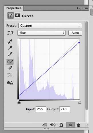 Создайте новый корректирующий слой Curves (Кривые). Перейдите в этом слое на синий канал и подтяните нижнюю точку, чтобы затонировать изображение в тенях и светах, тем самым добавив эффект сплит тонирования, как на скриншоте.