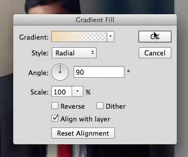 Снова создайте корректирующий слой GradientFill (Заливка градиентом) с цветом от f6dfb2 к прозрачному с настройками, как на скриншоте.