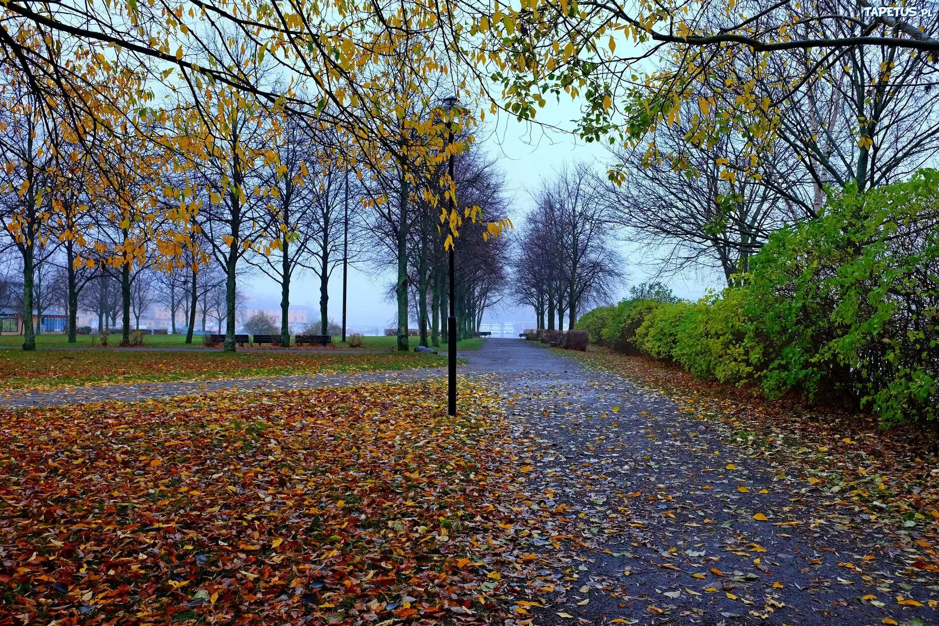Осенью часто бывают дожди, но бывает и солнечная погода. Листья постепенно облетают. Зимой все деревья голые. А вот сосны и ёлки остаются всегда зелёными. Их в парке много растёт. Многие птицы улетают в тёплые места. В небе часто видно, как летят журавли. Они построены в виде угла.