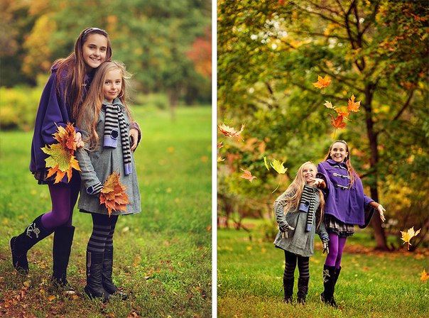 Детская одежда для съемки тоже должна быть тщательно подобрана. Нужно, чтобы в ней было, во-первых, тепло и комфортно, во-вторых, удобно. Девочки и мальчики должны воспитываться в гармонии, поэтому нужно подбирать вещи по цвету. Можно дополнить детский наряд не совсем привычными для ребенка вещами, например огромным теплым шарфом или смешной шапкой. Наряд девочек дополнят пелерины и муфты, если съемка запланирована в ноябре. Поскольку осень часто огорчает дождями, то можно использовать и этот момент, предложив ребенку яркие резиновые сапоги и огромный зонт того же цвета. При этом надо разрешить ему измерить глубину некоторых луж и не бояться брызг.