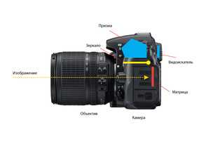 К корпусу камеры через байонет крепится объектив — элемент, с помощью которого изображение проецируется на матрицу. В следующей статье подробно описано устройство объектива фотоаппарата.