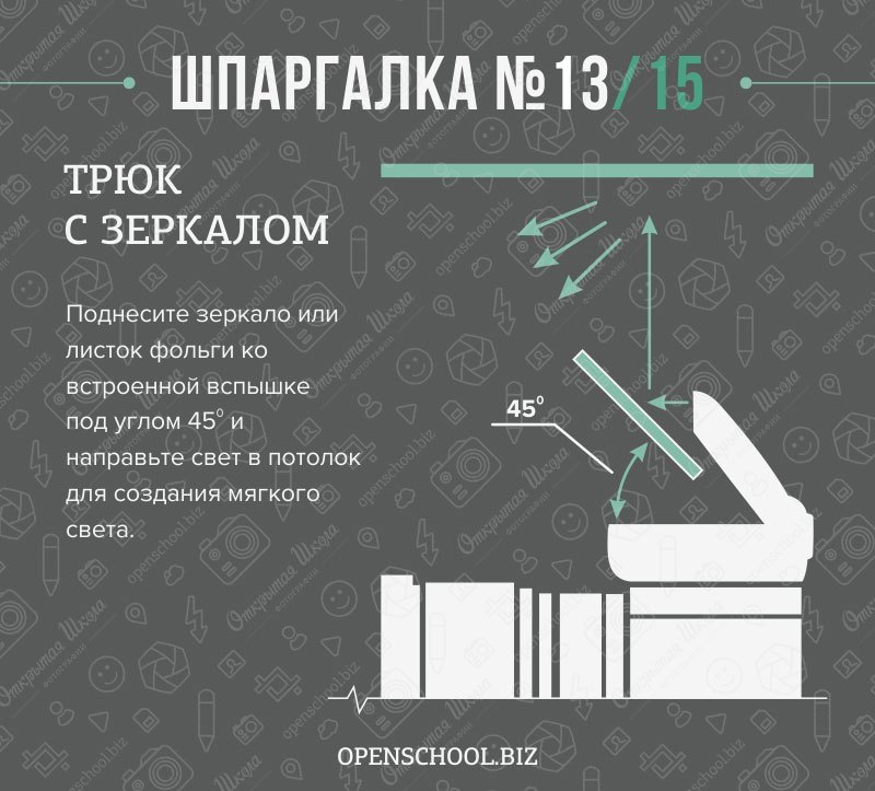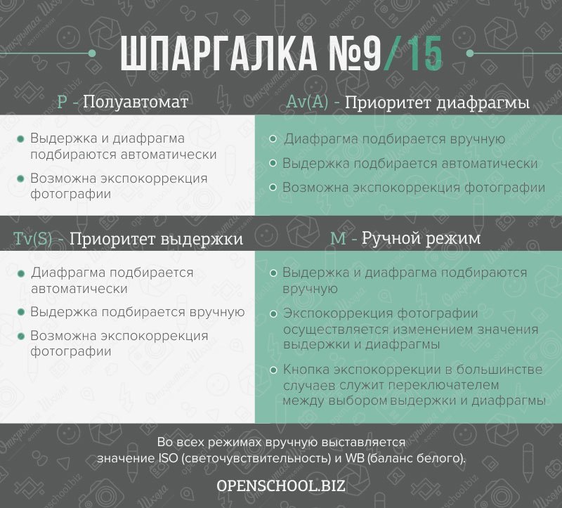 А также творческую — по построению кадра, чтобы не нарушить правила композиции и усилить фотографию с помощью художественных приемов. На начальном этапе фотографу приходится удерживать в памяти большой объем разной информации. Пока не наберешься опыта, каждая съемка превращается в небольшой экзамен. Некоторые преподаватели рекомендуют студентам написать шпаргалки по всему материалу, чтобы успешно сдать экзамен. Они не имеют в виду, что студент воспользуется шпаргалкой во время сдачи экзамена. Но, как показала практика, студенты, потратившие время на написание шпаргалки, обычно успешно сдают экзамены.