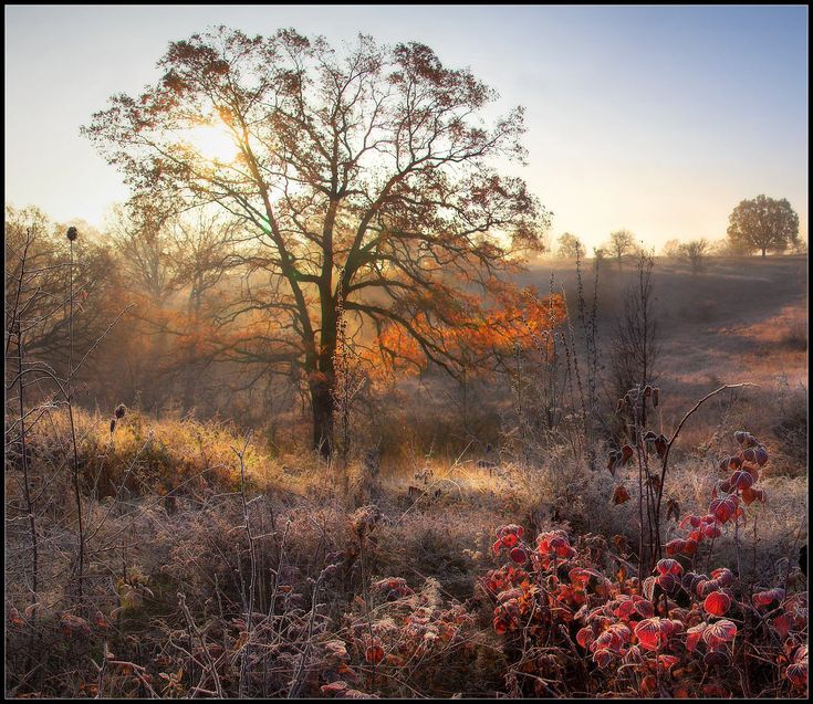 Выбор освещения зависит от предпочтений фотографа — оно позволяет создать нужную атмосферу и получить пейзажи более высокого качества. Одна из традиционных ошибок — это попытки снимать при резком солнечном свете. Несмотря на возможность запечатлеть насыщенные цвета, обычно в результате сцена получается слишком контрастной. Обратите внимание на отличия между этими фотографиями. Первая была создана при свете прямых солнечных лучей. Пейзаж хорошо виден, но ему не хватает атмосферности. Детали дерева отвлекают внимание зрителя, а в нижней части кадра можно заметить некрасивую полоску тени и даже тень, которую отбрасывает сам фотограф. Вернувшись к этой сцене чуть позже, когда дерево находилось в тени, ему удалось создать более атмосферную композицию, пусть и с меньшим количеством деталей. Теперь небо имеет нужный оттенок, дерево предстает перед зрителем в виде яркого силуэта, а туманный пейзаж выглядит более эффектно.