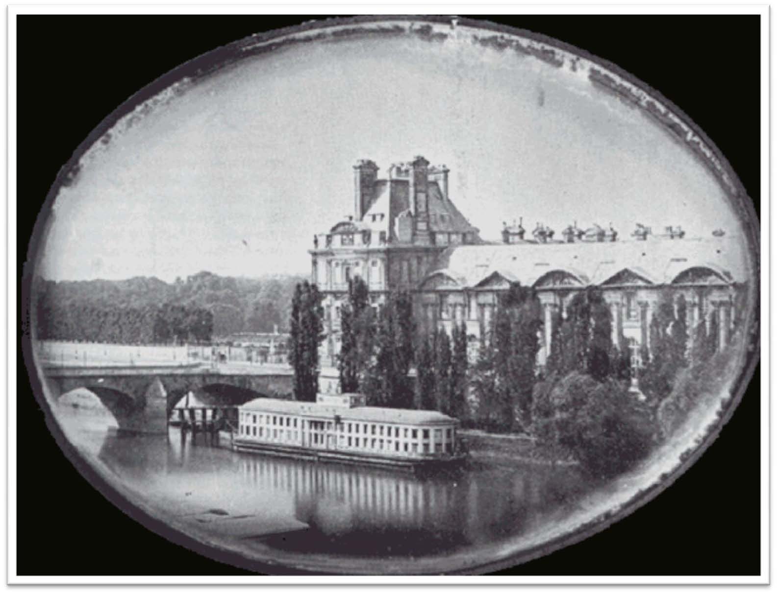 Первая фотография в мире «Вид из окна», 1826 Рождение фотографииЖозеф Нисефор Ньепс (7 марта 1765 – 5 июля 1833) – впервые (в 1820 г.) нашел способ закрепления изображения, получаемого в камере-обскуре, используя в качестве светочувствительного вещества асфальтовый лак. Этот процесс был назван им «гелиография» (в переводе с греческого – «нарисованная светом»).Талантливый художник-декоратор и энергичный предприниматель Луи Жак Манде Дагерр (18 ноября 1787 – 10 июля 1851) открыл в Париже театр нового типа – знаменитую «Диараму». Новизна техники декораций в «Диараме» заключалась в том, что картины декораций были написаны (самим Дагерром) на тонком полупрозрачном материале и поочерёдно менялись и освещались специальными прожекторами. Великолепное качество декораций и удачно подобранный репертуар нового театра обеспечили громадный успех этого предприятия, в том числе и финансовый. Однако самому Дагерру – человеку с творческим началом – было слишком утомительно ежедневно выполнять большой объём стереотипной работы, связанной с постоянным копированием изображений через камеру-обскуру. У него появилась идея о закреплении светового изображения, получаемого в камере-обскуре, т.е. идея фотографии. Начиная с 1826 г. Луи Жак Манде Дагерр организует в своём театре тайную лабораторию по разработке своего способа фотографии (получившего в последствии название «Дагерротипии»), и прилагает значительные усилия для решения этой задачи, но в таких делах необходим опыт профессионала, которым художник не обладает. В это время Ньепсу уже исполнилось 64 года, Дагерр же был моложе своего компаньона более, чем на 20 лет. Они вместе ведут интенсивные совместные поиски, проверяют десятки гипотез и, наконец, изобретатели пробуют йод в качестве светочувствительного вещества. Ньепс не очень-то верит в йод, поскольку уже делал опыты с галогенидами серебра и хорошо знает, что подобное изображение необратимо чернеет при извлечении пластинки на свет. К сожалению, Ньепс и Дагерр пока не знают, что ещё в 1818 г. английский астроном и физик Джон Гершель (1792 – 1871) обнаружил свойство гипосульфита прекращать почернение на свету иодистого серебра (т.е. закреплять изображение). Нисефор Ньепс скончался в 1833 г. Согласно договору между Ньепсом и Дагерром, продолжателем и наследником дела отца оставался сын Ньепса – Исидор Ньепс, но молодой человек продаёт оставшуюся часть родового имения и всё чаще занимает в долг у Дагерра. Наконец, Дагерр возвращается к опытам с иодидом серебра и открывает способ фиксации светового изображения. Продолжая разрабатывать идею применения гелиографии для выполнения стереотипных работ в своей «Диараме», он использует металлический лист, пластину размером 216х164 см, покрывает её тонким слоем серебра и помещает в ящик, на дне которого был насыпан порошок иода. Через небольшое время пары иода за счёт образования светочувствительного иодида серебра окрашивали серебряный слой пластины в красивый розовый цвет. После экспозиции в камере-обскуре выполнялось проявление. Для этого в другой ящик помещалась подогреваемая на спиртовке ванночка со ртутью и проявляемая пластина. Пары ртути оседали на светлых участках пластины и проявляли изображение (позитив). Об этом открытии писали все газеты того времени. В 1838 г. на улицах Парижа то там, то тут появлялись с