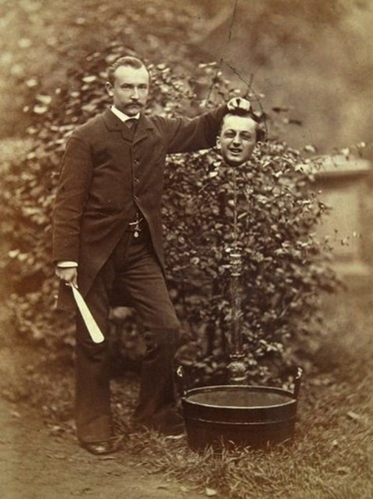 Первую фотографию-розыгрыш сделал в 1840 году Ипполит Байярд, который конкурировал с Луи Дагером, претендуя на звание «отец фотографии». Байярд якобы первым разработал фотографический процесс, но повременил с докладом о своем достижении. А расторопный Дагер представил отчет о дагерротипии, не упомянув Байярда, который отчаявшись сделал свой автопортрет с прискорбной подписью. В ней говорилось о том, что безутешный изобретатель утопился.