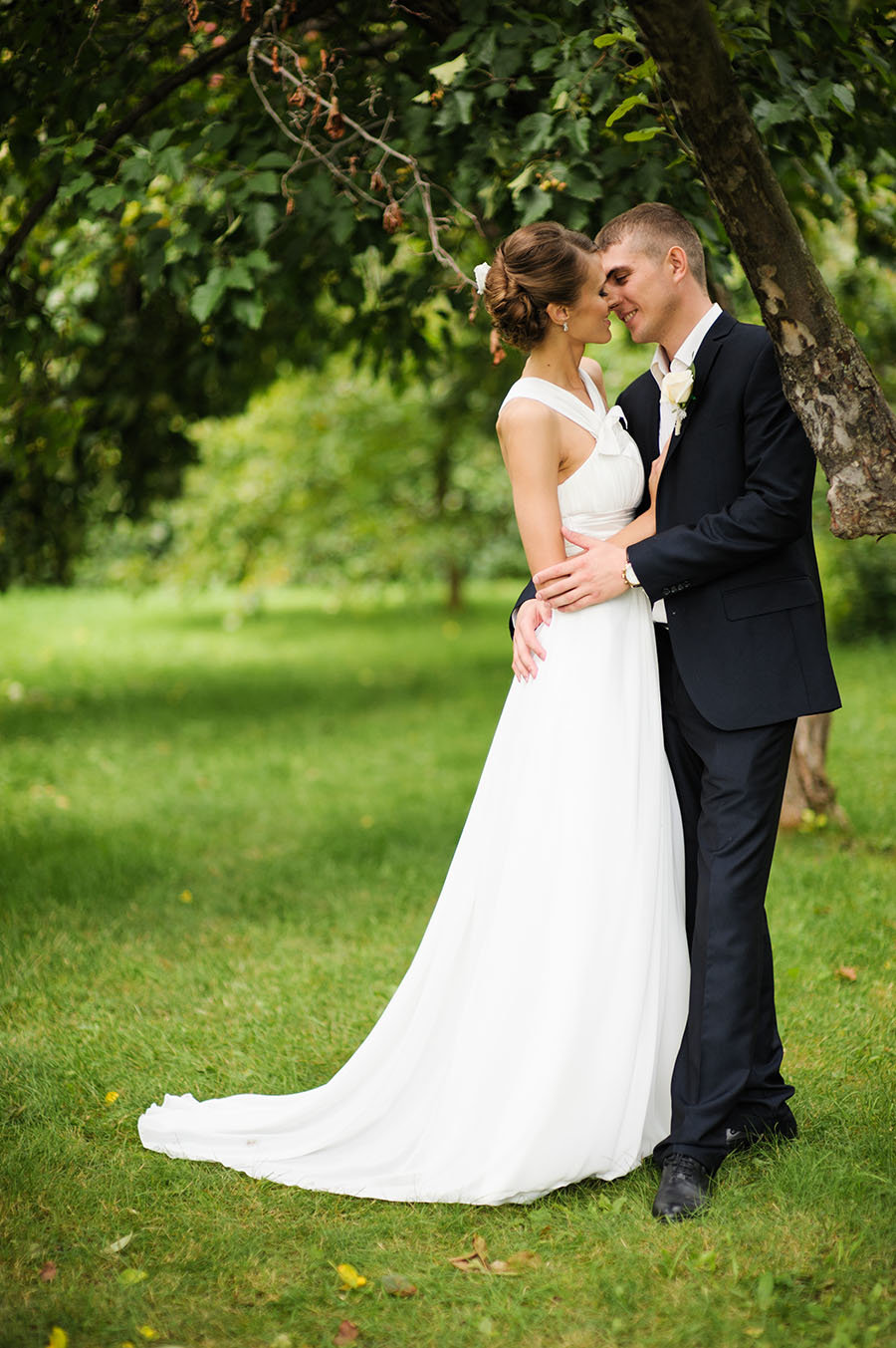 Ещё одна очень тёплая и романтичная поза: невеста обнимает жениха за шею.