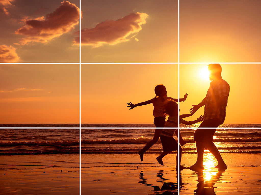 Для начала представьте, что две горизонтальные и две вертикальные линии делят кадр на равные части: три вертикальных и три горизонтальных.