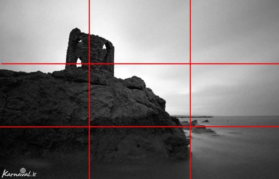 Большая часть кадра отводится небу или земле в зависимости от задумки. Сам же объект, зрительный центр кадра располагается на пересечении линий, которые делят кадр на трети.