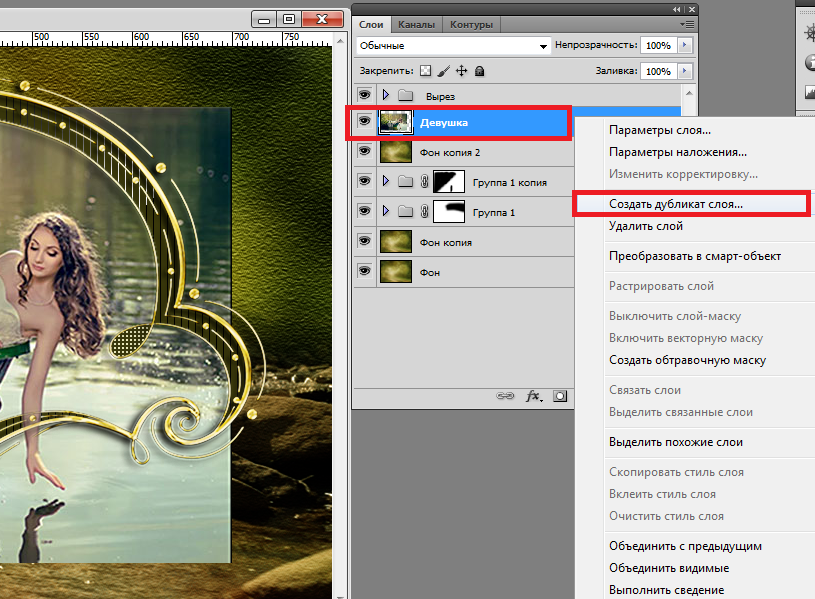 Третий способ — щелкнуть правой кнопкой мыши (Win) / Control-click (Mac) непосредственно на слое на панели «Слои»:
