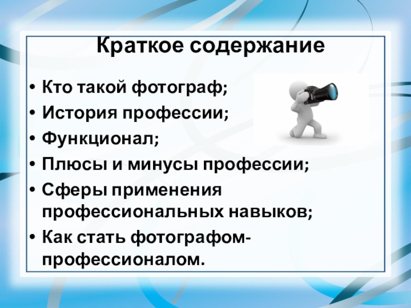 Очень интересной и важной чертой в профессии фотографа является то, что её можно изучить без сложного специального образования. Существует даже такая шутка: «Я теперь фотограф, вот фотоаппарат купил!» И эта мысль не далека от истины.