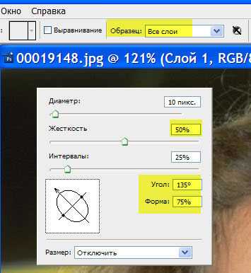 ΠΠ±Π»Π°ΡΡΡ ΠΏΠΎΠ΄Π±ΠΎΡΠΎΠ΄ΠΊΠ° ΠΈΡΠΏΡΠ°Π²Π»ΡΠ΅ΠΌ ΠΈΠ½ΡΡΡΡΠΌΠ΅Π½ΡΠΎΠΌ Clone Stamp ΡΠ°Π·ΠΌΠ΅ΡΠΎΠΌ 210 ΠΏΠΈΠΊΡΠ΅Π»Π΅ΠΉ ΠΈ Π½ΡΠ»Π΅Π²ΠΎΠΉ ΠΆΠ΅ΡΡΠΊΠΎΡΡΡΡ, opacity ΠΈΠ½ΡΡΡΡΠΌΠ΅Π½ΡΠ° ΡΠΌΠ΅Π½ΡΡΠ°Π΅ΠΌ Π΄ΠΎ 15%. ΠΡΡΠΎΡΠ½ΠΈΠΊ ΠΊΠ»ΠΎΠ½ΠΈΡΡΠ΅ΠΌΠΎΠΉ ΠΎΠ±Π»Π°ΡΡΠΈ ΡΠΊΠ°Π·Π°Π½ ΠΏΠ΅ΡΠ΅ΠΊΡΠ΅ΡΡΡΠ΅ΠΌ.