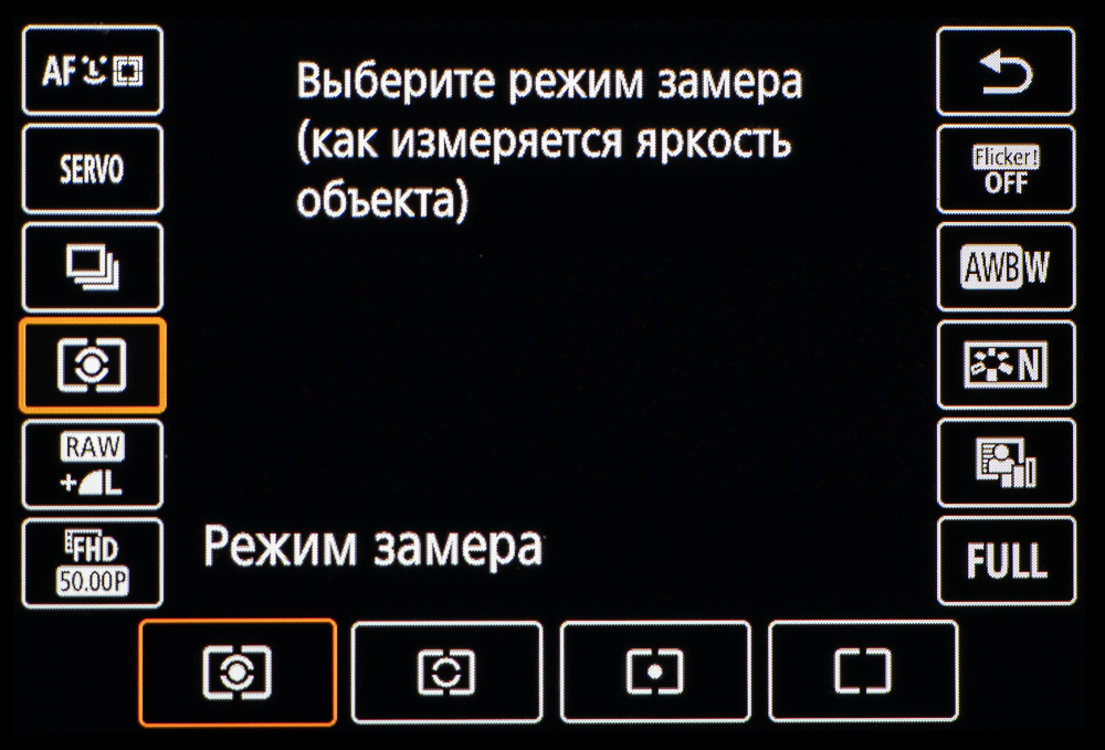 Режим измерения | — Оценочный замер | Устанавливает режим измерения. Это также можно изменить в меню быстрого управления. | |