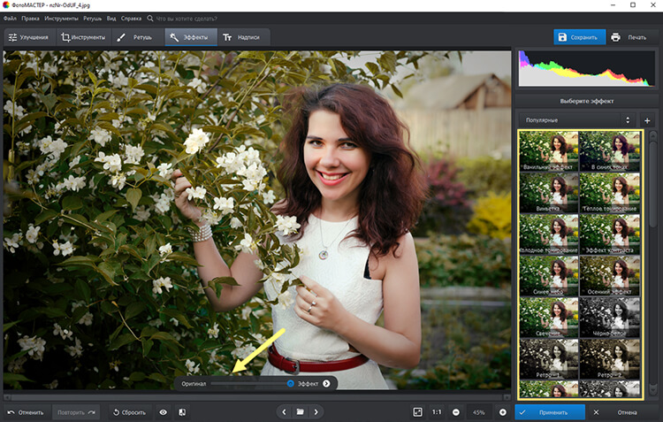 Но даже если со светом и цветовыми характеристиками снимка все в полном порядке, то программа Фотор все равно будет востребована! И всё это по причине того, что позволяет использовать самые разные фотоэффекты, создающих для кадра неповторимый стиль и художественный почерк. Причем рисковать исходным файлом не придется, так как все применяемые эффекты фото можно сперва оценить на превью, а уже после этого сохранить в виде отдельного файла .