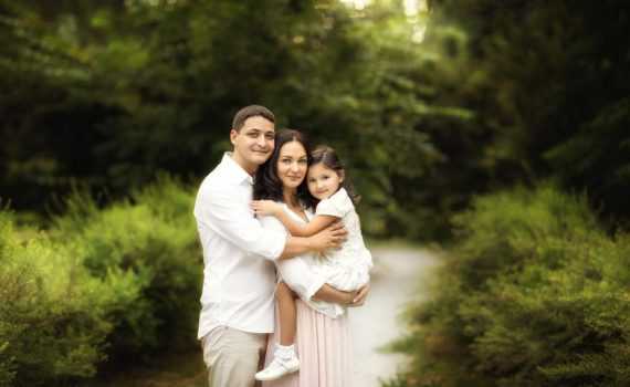 Оригинальные получаются фотографии, когда все члены семьи одеваются похоже. Например, белая футболка и джинсы. Можно в семейном стиле просто попозировать перед камерой, а можно с ребенком придумать затеи “на ходу” (полетать самолетиком, посадить на шею папе, всем дружненько подпрыгнуть вверх).