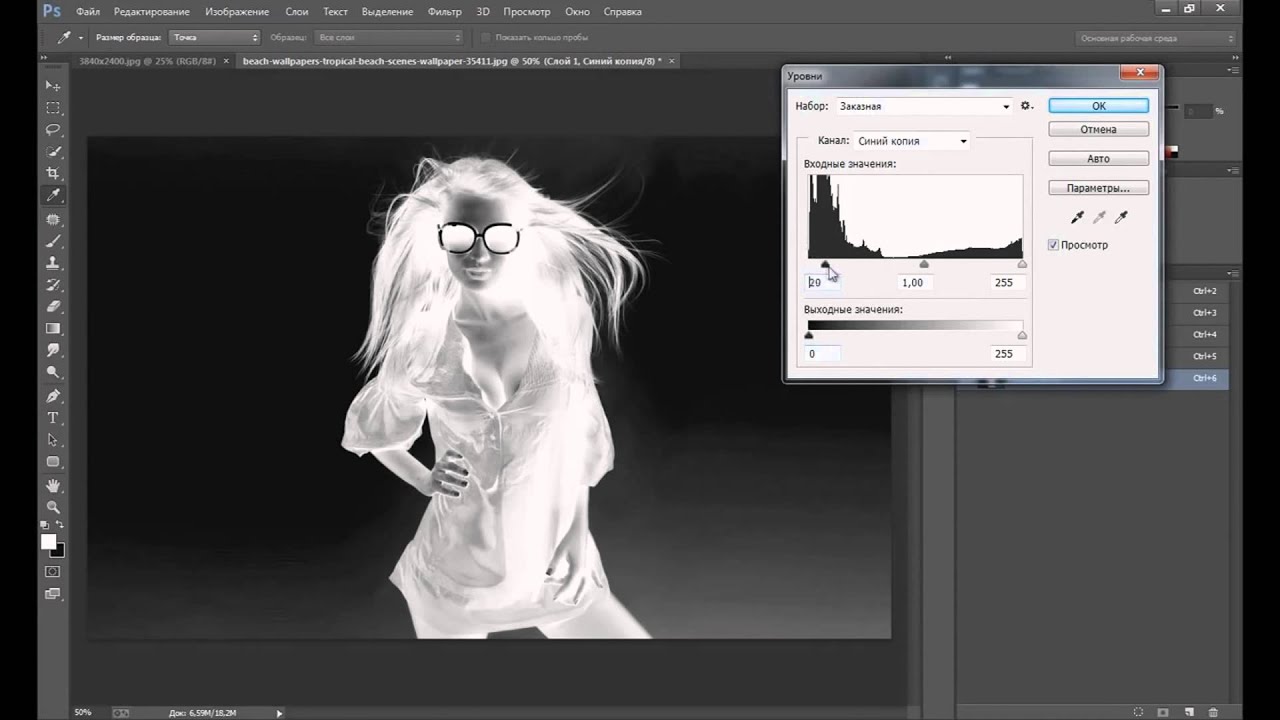 Зайдите в меню Image — Adjustments — Levels (Изображение — Коррекция — Уровни / Сочетание клавиш «Ctrl+L»).