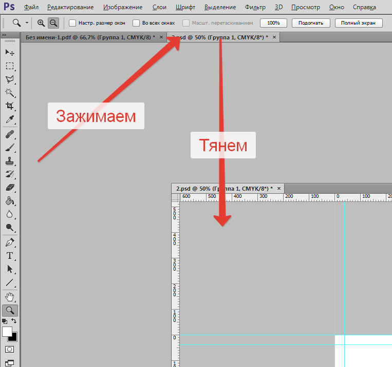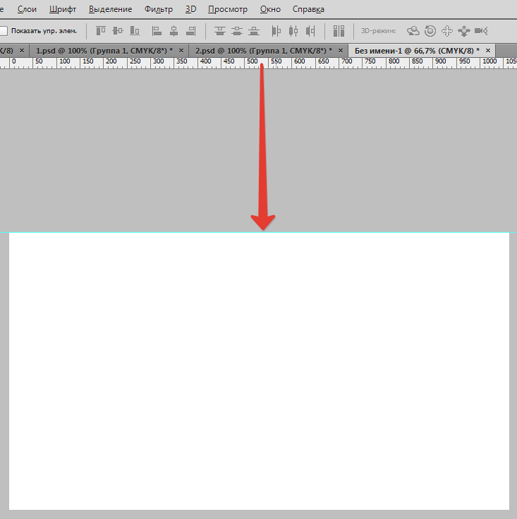 В рабочей области вы увидите линейки и направляющие. Перетяните направляющие в нужное положение: отступы сделайте по 2 мм со всех сторон