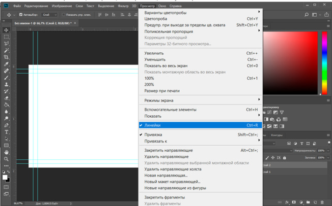 - Настройте поля под обрез при печати. В главном меню нажмите “Просмотр”-”Линейки”.