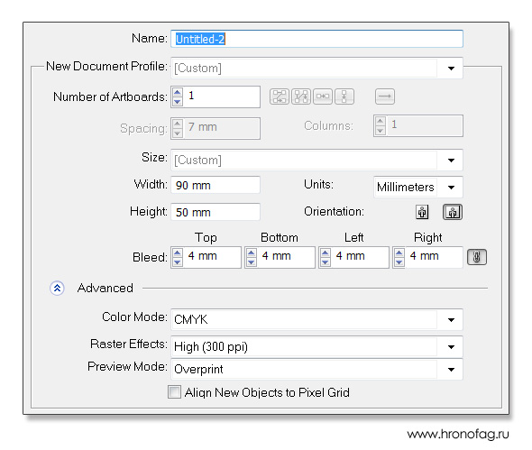 Все эти параметры для визитки необходимо указать в окне создания нового файла в Фотошопе.