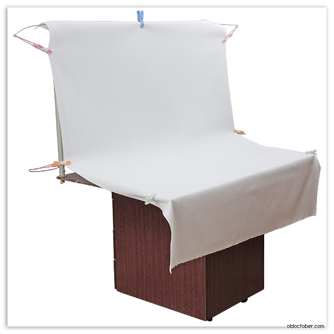Описанная конструкция рамы позволяет без труда собрать «бестеневой бокс». В качестве материала для стенок можно использовать молочный полиэтилен или тонкую белую ткань.