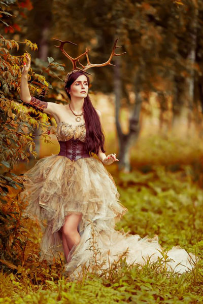 Макияж и одежда должны быть выполнены исключительно в осенних тонах, лучше всего в золотой палитре. Также можно украсить открытые участки тела блестками или позолотой.
