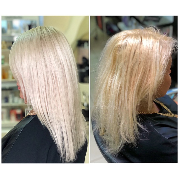 Если тонироваться на 3%(так тоже можно, но это уже будет больше похоже на покраску) – оттенок получится более интенсивный, будет держаться дольше. НО, так как структура волос пористая (обесцвеченная), они впитают пигмент и вы рискуете лишиться белого блонда. Оттенок со временем смоется, но часть пигмента так и останется в волосах.